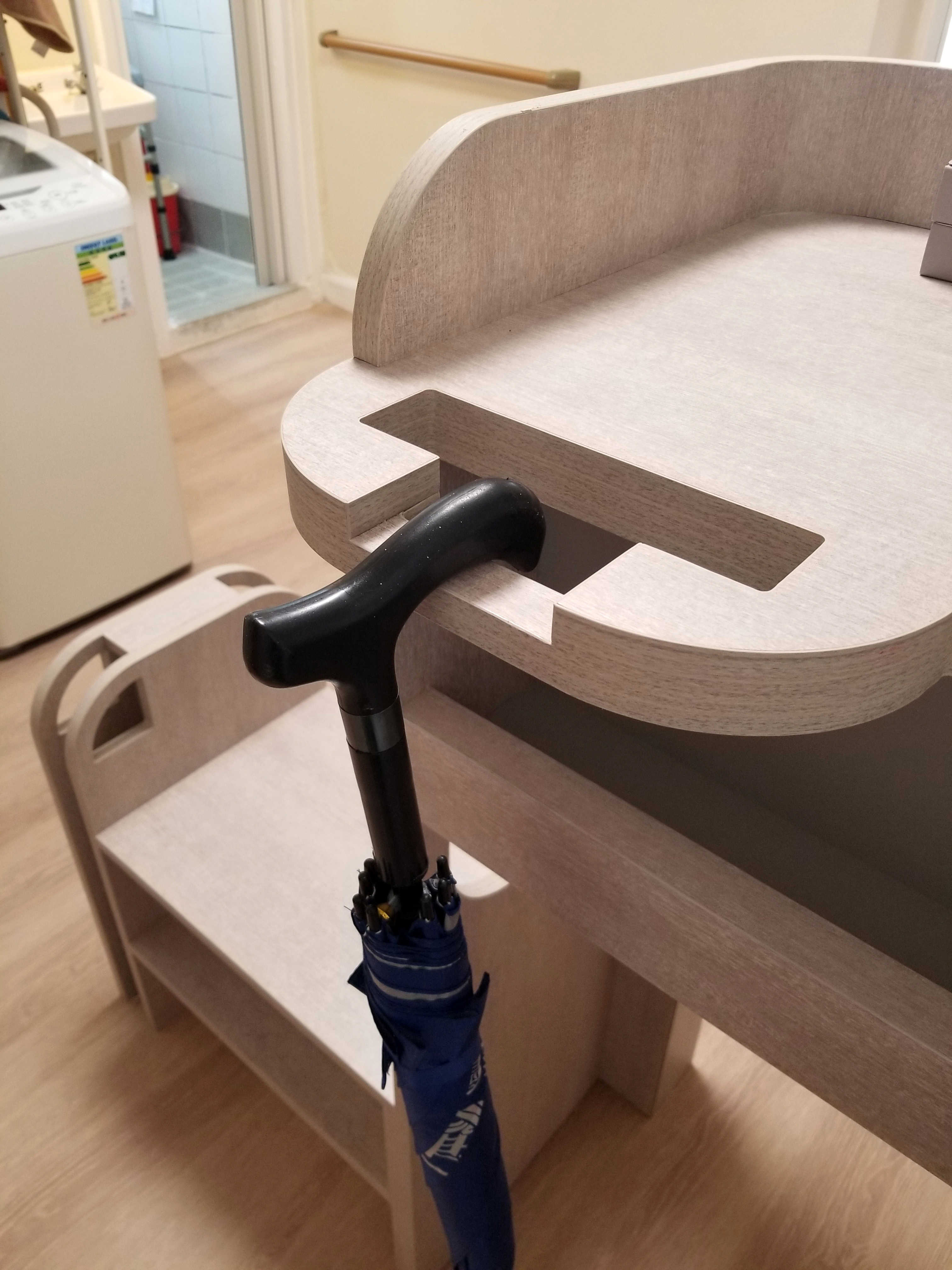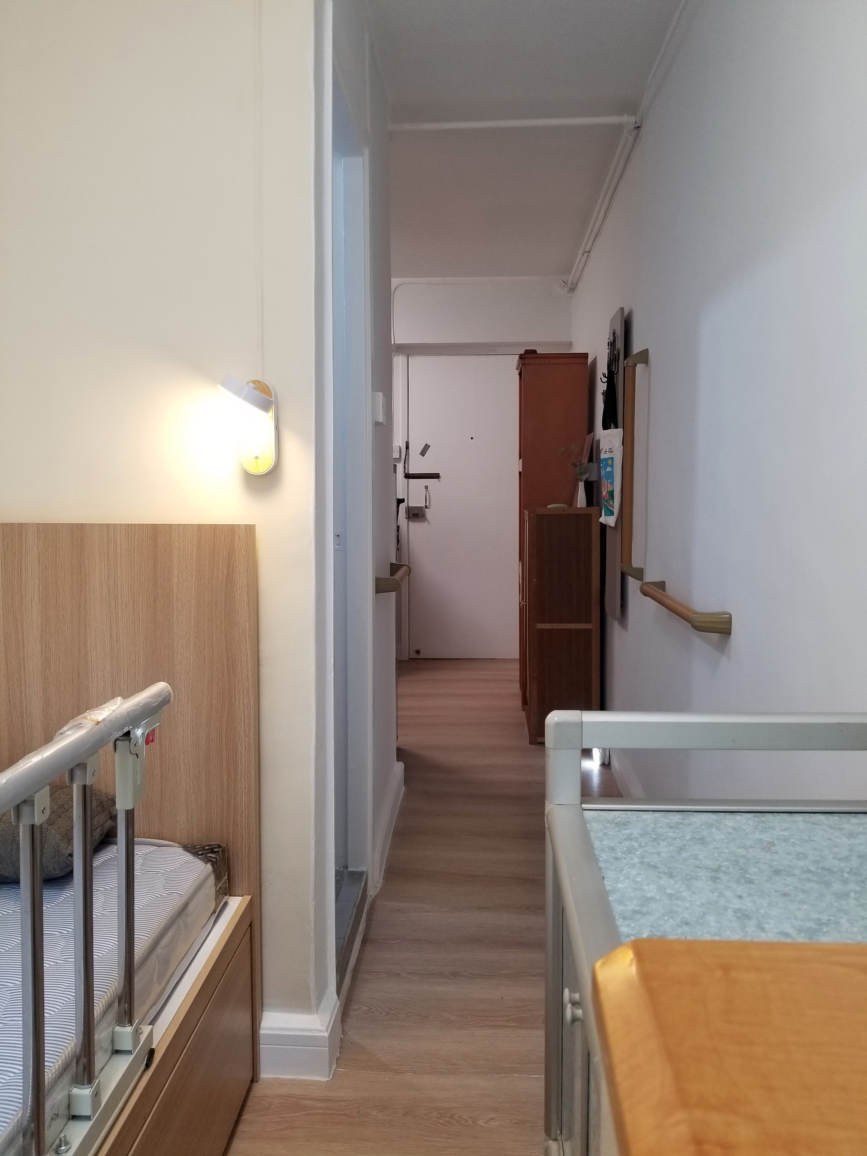 After an assessment by the occupational therapist and the design team of Ms. Lee’s mobility and home layout, several improvements were implemented to enhance her independence and safety at home. The occupational therapist focused on supporting Ms. Lee’s self-care abilities by installing handrails along the main passageways, bed rails beside her bed, and an electric clothes drying rack by the window.
